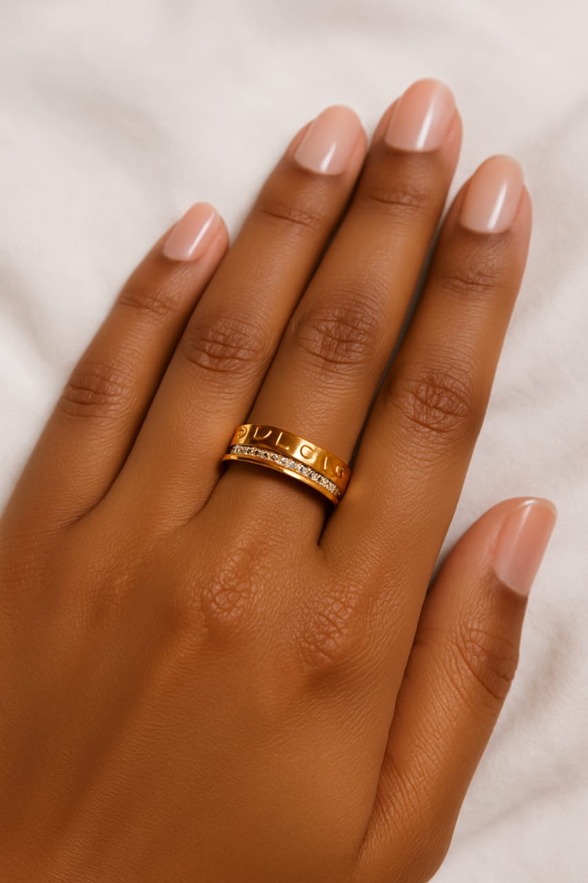 Turn heads with this luxurious dual-band designer ring from Bold & Beauty Jewels. Crafted in a rich gold-tone finish, this ring features bold engraved detailing on one band and a shimmering line of CZ stones on the other, creating a perfect balance of elegance and edge. Whether you’re dressing up for a special occasion or adding a touch of glamour to your everyday style, this ring makes a bold statement.